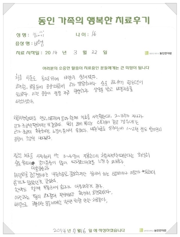 ¿©±â¿¡ ¸Å´Þ ¼ö¸é°Ë»ç¸¦ ÅëÇØ¼ ³ªÀÇ ÄÚ°ñÀÌ, ¹«È£Èí, »ê¼ÒÆ÷ȵµ°¡ ¾ó¸¶³ª º¯È°¡ ÀÖ´ÂÁö¸¦ üũÇϸç Ä¡·á¸¦ ÇÏ½Å´Ù¸é ¸¸Á·½º·¯¿î °á°ú¸¦ º¸½Ç ¼ö ÀÖÀ¸¸®¶ó »ý°¢ÇÕ´Ï´Ù.